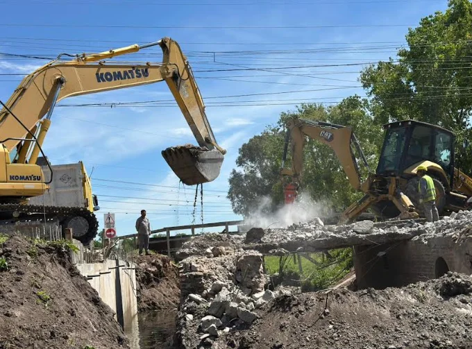 Actualmente, los trabajos se desarrollan en la intersección de las calles Presidente Roberto M. Ortiz y Álvaro Pintos, dentro del Sector Industrial Planificado de Almirante Brown, donde se está demoliendo la antigua alcantarilla sobre el Arroyo del Rey para construir una nueva estructura que funcionará como puente, mejorando la circulación y el drenaje del agua en toda esa zona.